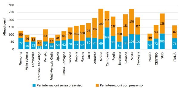 Nelle reti di distribuzione, secondo i dati pubblicati sulla stessa relazione a proposito di interruzioni con e senza preavviso, “la durata media per utente in bassa tensione in Italia si attesta a 163 minuti (185 minuti nel 2023): 107 minuti al Nord (115 minuti nel 2023), 165 minuti al Centro (174 minuti nel 2023) e 244 minuti al Sud (291 minuti nel 2023)”.
