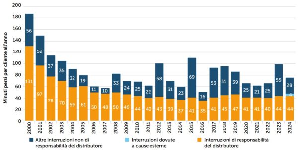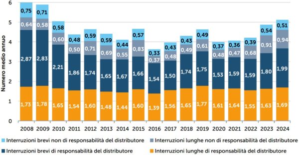 I dati evidenziano un miglioramento della durata media delle interruzioni senza preavviso e “un lieve peggioramento per il numero medio delle interruzioni senza preavviso lunghe e brevi per utente in bassa tensione”. Il miglioramento della durata media delle interruzioni è “in parte associato al minor impatto di eventi meteorologici estremi (alluvioni, tempeste di vento e ondate di calore)”. Le ondate di calore, ad esempio, sono responsabili dei danneggiamenti di alcuni componenti, come i giunti e i terminali dei cavi e, quindi, di interruzioni che si verificano sia sulle rete di distribuzione primaria di media tensione sia sulle reti di bassa tensione.