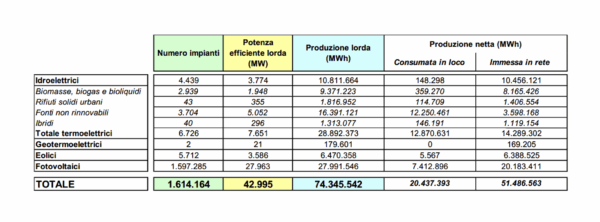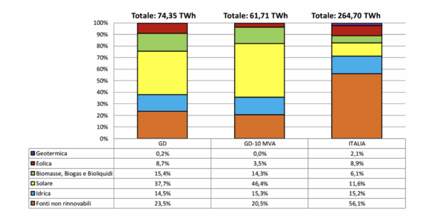 Fra le fonti rinnovabili, il maggior contributo è quello dei sistemi fotovoltaici. Il numero totale di questi impianti ammonta a circa 1,6 milioni (1.597.285 impianti), per una potenza efficiente lorda di quasi 28 GW e una produzione lorda di quasi 28.000 GWh/anno.