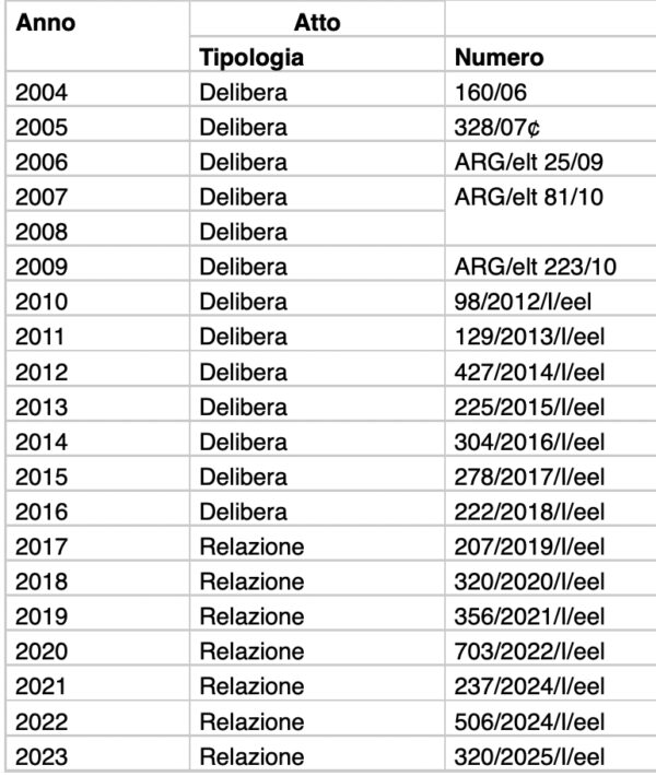 Il monitoraggio dello sviluppo degli impianti di generazione distribuita in Italia “con particolare riferimento alle implicazioni che il proprio sviluppo comporta in termini di diversificazione del mix energetico, di sviluppo sostenibile, di utilizzo delle fonti marginali e di impatto nella rete elettrica” è eseguito annualmente dall’ARERA dal 2006 (dati 2004). In ordine temporale, l’ultima relazione – riferita ai dati dell’anno 2023 – è stata pubblicata l’11 luglio scorso con la Relazione 8 luglio 2025, n. 320/I/eel.